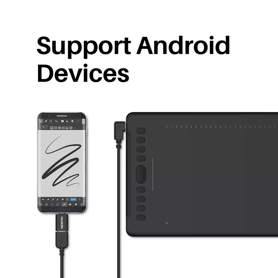 Compatible with Android 6.0 or later, Huion H1161 drawing tablet could be connected with android phones or other android devices via an adapter. When computer is not available, you still could take it out for any place to record your inspiration. It definitely enhance work mobility and convenience. Note: The cursor will not show up in Samsung Galaxy phone and tablet except for Note Serials.