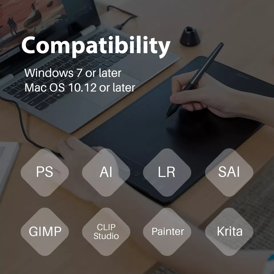 Pen tablet H1161 is compatible with not only Windows and Mac OS but also Android OS and Chrome OS 88 or later. Use with popular apps like Photoshop, Paint Tool Sai, Illustrator, Sketchbook Pro, Medibang Paint Pro, and much more!