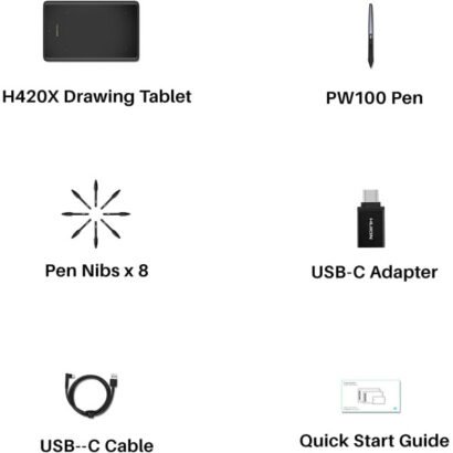 H420X X1;Pen PW 100 X1;Pen nibs X8;USB-C adapter X1;USB-C cable X1;Quick start guide X1. One Year Warranty.