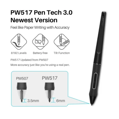 The PW517 digital pen has 8192 levels of pressure sensitivity as well as tilt support, so users can draw and sketch naturally as they would with a pen or pencil.
