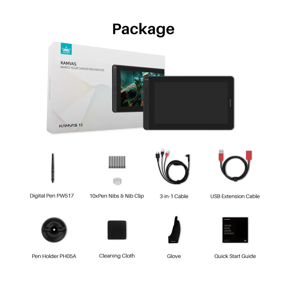 Draw, color, and design comfortably on a couch or at a desk with the HUION Kamvas 13 Pen Display. Featuring a 13.3″ display with an 11.57 x 6.51″ active area and weighing around two pounds, the Kamvas 13 is ideal for creative users who want to work unrestricted. Built with an IPS panel, it provides users with vivid colors and wide 178° viewing angles. Furthermore, the display has an anti-glare coating and is laminated for reduced parallax. Its eight express keys can be programmed to for a variety of functions. The Kamvas 13 is compatible with both Mac and Windows systems, and comes with a stylus to help you get started.