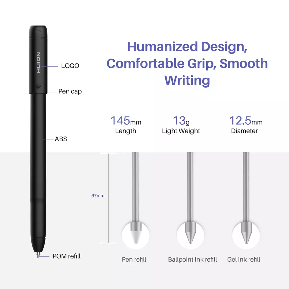 HUION Scribo is compatible with gel ink refill and ballpoint refill to adapt different writing scenarios, you can also replace the plastic pen nib to make it a 8192 Levels battery-free pen on graphics tablet for drawing or design.