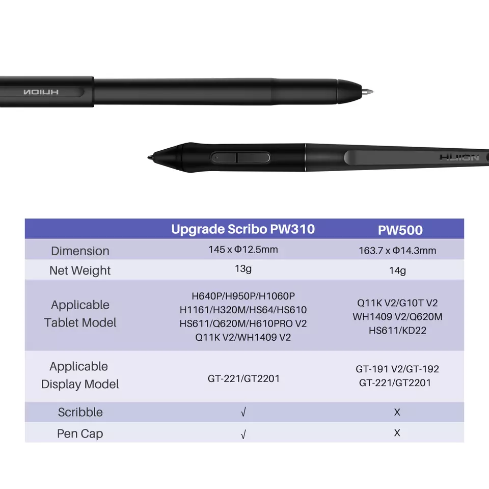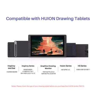 Scribo PW310 is suitable for mostly Huion drawing tablets, compatible with H640P/H950P/H1060P/H1161/WH1409 V2/Q11K V2/H320M/Q620M/HS64/HS610/HS611/H610 Pro V2/kamvas pro 22/Pro 22(2019). Notes: make sure your tablets support OTG mode before you use it with Android devices.