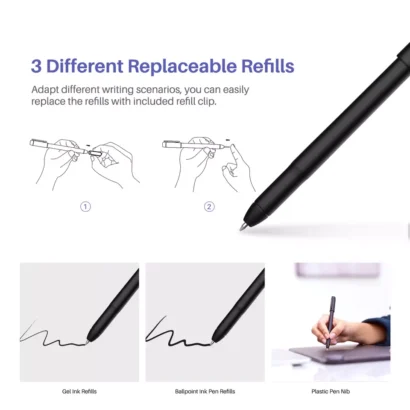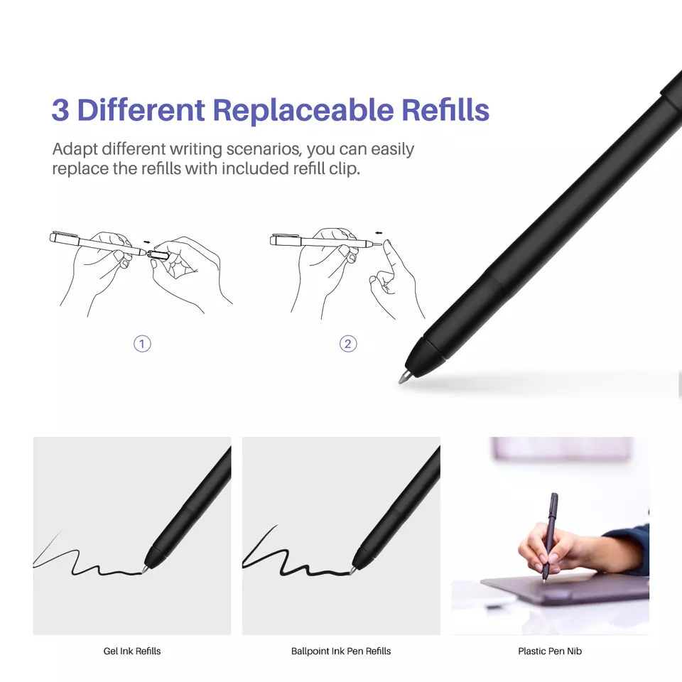 3 different refills: Designed for daily usage, PW310 is compatible with gel ink refills and ballpoint refills to adapt different writing scenarios. Also, you can replace the plastic pen nibs to make the PW310 a 8192 level battery-free pen on graphics tablet for basic drawing and design.