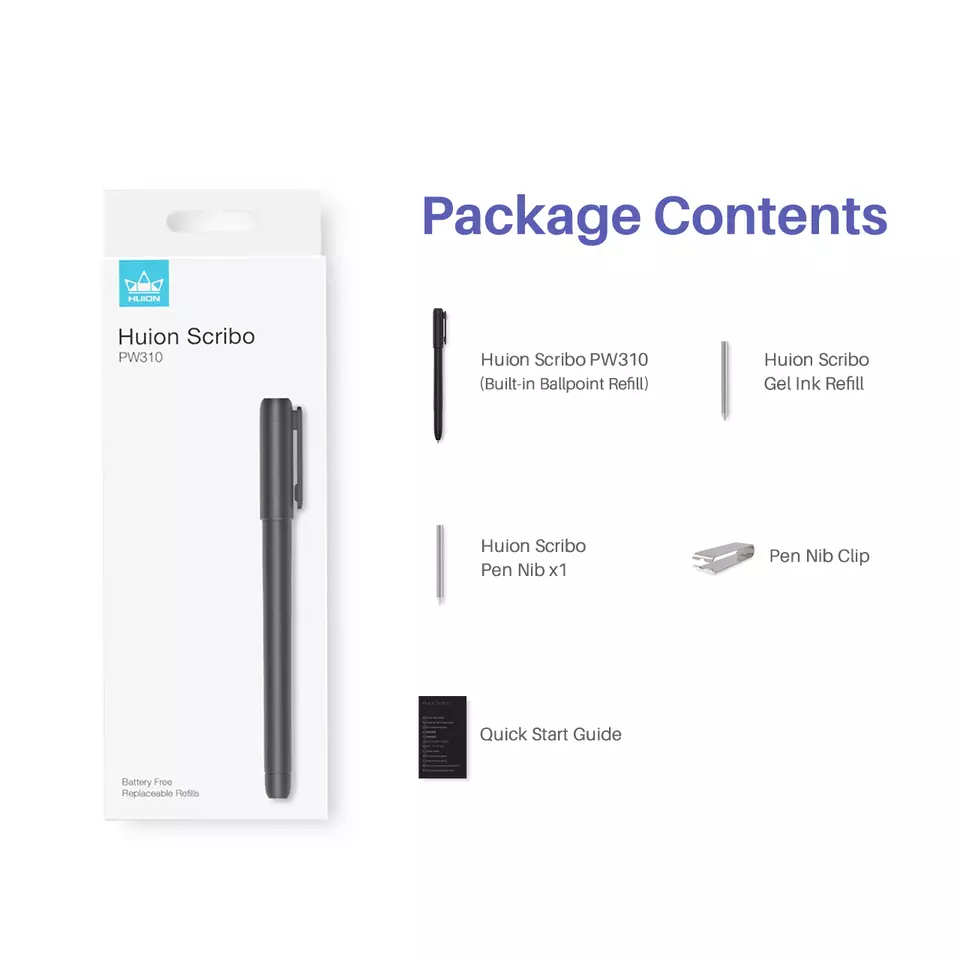 What You Get: Huion Scribo PW310(Built-in Ballpiont refill);Gel Ink Pen Refill×1;Plastic Refill×1;Quick Start Guide;Refill Clip;Free lifetime technical support