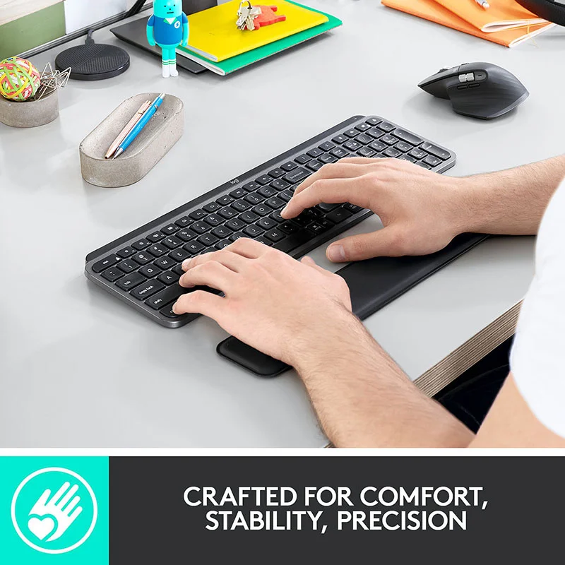 Features smart backlighting to increase productivity—regardless of lighting or the time of day. MX Keys for Business senses its surrounding ambient light automatically adjusting the keys’ backlighting brightness. The backlighting turns on as hands approach it, then off when not in use.