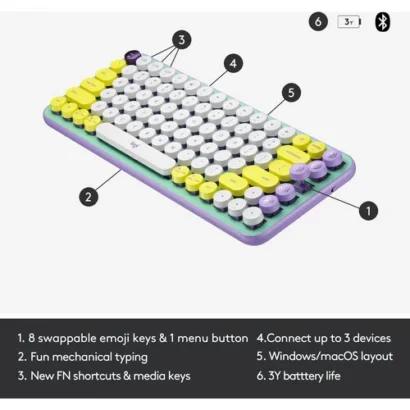 Pair POP Keys with up to 3 devices and hop between them using the Easy-Switch keys; connect via Bluetooth or Logi Bolt USB receiver on Windows, macOS, Chrome OS, Android, iPadOS or iOS